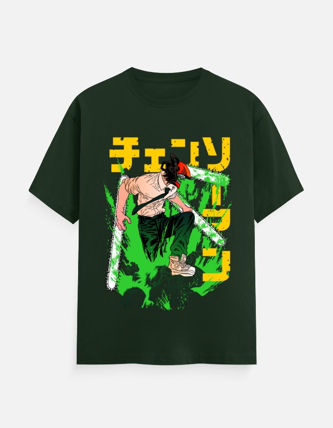 This exclusive Chainsaw Man T-Shirt embodies the chaotic energy and brutal power of Denji’s devil form. The design features a stylized illustration of Chainsaw Man in a dynamic pose, with his signature chainsaw blades and a vibrant green background that captures the intensity of his fights. The artwork is complemented by Japanese katakana text from the series, highlighting the iconic name. As a result, you get a uniquely bold piece of apparel. It truly highlights your appreciation for this iconic character.